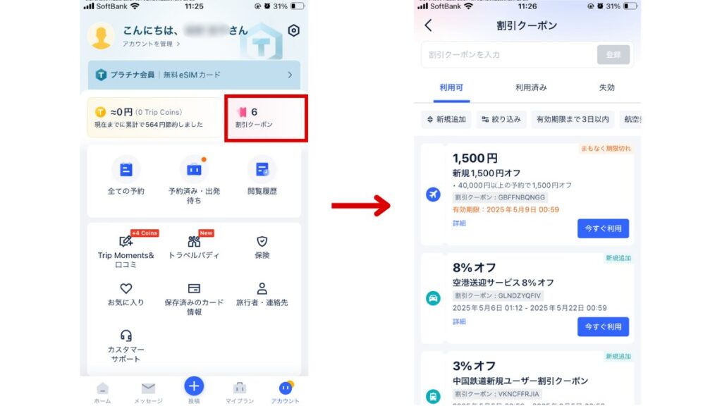 Trip.comトップページにて、右上のアイコンをクリックし、「割引クーポン」を選択することで、取得したクーポンを確認できます。