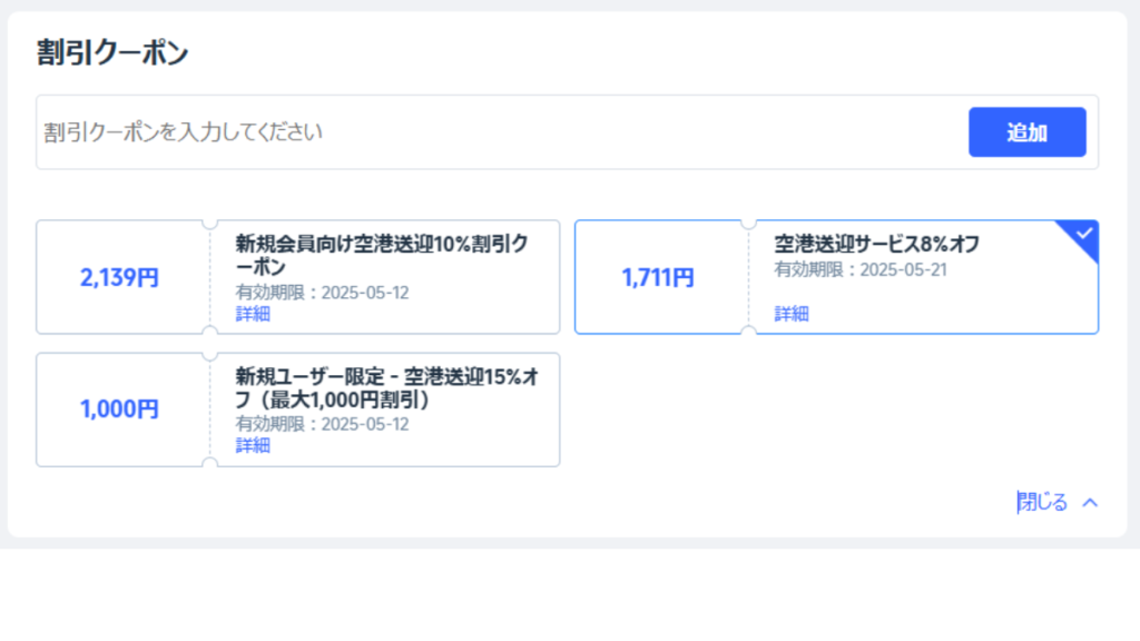 クーポン選択画面が表示されるので、クーポンを選択するか、コードを入力します。 ※持っているクーポンが適用できるものであれば、自動で選択してくれます。
